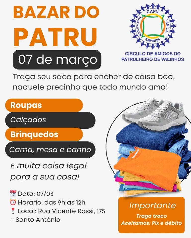 O bazar mais aguardado da cidade já tem data marcada: será no dia 7 de março, das 9h às 12h, na sede do Círculo de Amigos do Patrulheiro de Valinhos, localizada na Rua Vicente Rossi, 175 – Santo Antônio.