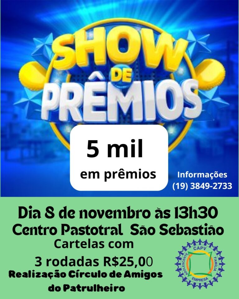 Em comemoração aos 55 anos de fundação, o Círculo de Amigos do Patrulheiro de Valinhos prepara uma tarde especial de festa e solidariedade. No dia 8 de novembro, a partir das 13h30, o Centro Pastoral São Sebastião será palco de um Show de Prêmios que promete diversão, reencontros e mais de R$ 5 mil em prêmios, incluindo eletrodomésticos e outros brindes.